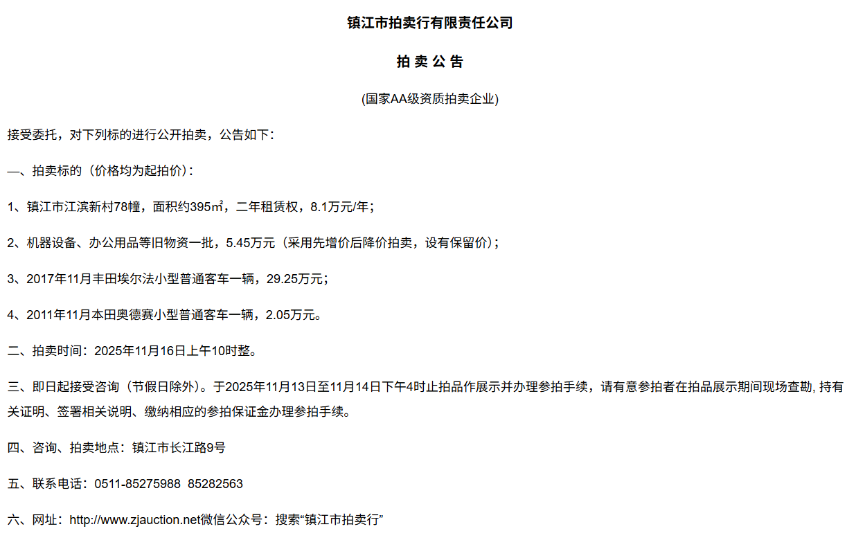 鎮江市拍賣行有限責任公司拍 租 公 吿(國家AA級資質拍賣企業)接受委托,對下列標的進行公開拍租(三拍),公告如下:—、拍租標的(以下價格均為半年至3年租賃權起拍價):1.  建行揚中豐裕支行營業網點二、三、四層經營用房(揚中市三茅鎮三豐南路5號),租賃面積約1080㎡,每層面積約360㎡,三拍底價11.98萬/年(0.3元/平方米/天)。2.  建行揚中油坊支行營業網點三、四層經營用房(揚中市油坊鎮太陽路129號),租賃面積約590㎡,每層面積約295㎡,三拍底價5.34萬/年(0.25元/平方米/天)。3. 建行揚中八橋支行營業網點三、四層經營用房(揚中市八橋鎮太平北路29號),租賃  面積約400㎡,三層約185㎡,四層約215㎡,三拍底價4.43萬/年(0.25元/平方米/天)。以上3套房產均可分層部分出租,拍租價=拍租面積*每平方米每天的租賃單價4. 建行鎮江團山路支行營業網點一層經營用房(鎮江市檀山路8號60幢102、103室),租賃面積約597.09㎡,三拍底價34.52萬/年。5. 建行丹陽原賢橋分理處營業用房(丹陽市城河路15-21號),租賃面積約93.88㎡,二拍底價7.16萬/年。二、拍租時間:2025年11月23日上午10時整。三、即日起接受咨詢(節假日除外)。于11月17日至11月21日下午4時止拍品作展示并辦理參拍手續,請有意參拍者在拍品展示期間現場查勘,持有關證明、簽署相關說明、繳納相應的參拍保證金辦理參拍手續。四、咨詢、拍租地點:鎮江市長江路9號五、聯系方式:0511-85275988   13655299933楊先生六、網址:http://www_zjauction_net.spotfreeh20.com;微信公眾號:搜索“鎮江市拍賣行” 拍品清單2025.11.23序號名稱起拍價(元)標的說明1建行揚中豐裕支行營業網點二、三、四層經營用房(揚中市三茅鎮三豐南路5號),租賃面積約1080㎡,每層面積約360㎡三拍底價11.98萬/年(0.3元/平方米/天)1、1-3號房產均可分層部分出租,拍租價=拍租面積*每平方米每天的租賃單價;2、意向競拍人在拍賣前需持營業執照或身份證與委托方說明租賃房產經營業態,確定意向后出具房產承租用途承諾書,經委托方審核后,方可交納保證金參加競拍;3、租賃期限為半年至3年(承租方與出租方協商而定),承租方每半年或一年結付租金,租賃期間的水、電費用及其它相關費用均由承租方承擔;4、承租方不得用于經營和保管危險物品,不得用于開設餐飲、娛樂等可能嚴重影響消防安全、運營安全的經營業態,不得用于經營委托貸款、小額貸款等可能冒用委托方名義,帶來聲譽風險的經營業態。租賃期內,承租方不得破壞墻體結構,自行成就消防、安全等使用條件,不得擅自將租賃房屋轉租、轉讓給他人使用,否則委托方有權收回房屋;5、拍租成交后,承租方將租金交至出租方指定賬戶,傭金交至拍賣方賬戶(拍租傭金為該房屋一個月租金)。承租方憑租賃合同無息退還保證金。2建行揚中油坊支行營業網點三、四層經營用房(揚中市油坊鎮太陽路129號),租賃面積約590㎡,每層面積約295㎡三拍底價5.34萬/年(0.25元/平方米/天)3建行揚中八橋支行營業網點三、四層經營用房(揚中市八橋鎮太平北路29號),租賃面積約490㎡,每層面積約245㎡三拍底價4.43萬/年(0.25元/平方米/天)4建行鎮江團山路支行營業網點一層經營用房(鎮江市檀山路8號60幢102、103室),建筑面積約597.09㎡三拍底價34.52萬/年5建行丹陽原賢橋分理處營業用房(丹陽市城河路15-21號),建筑面積約93.88㎡二拍底價7.16萬/年